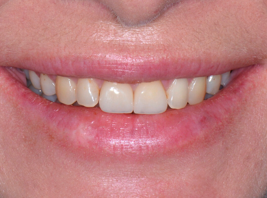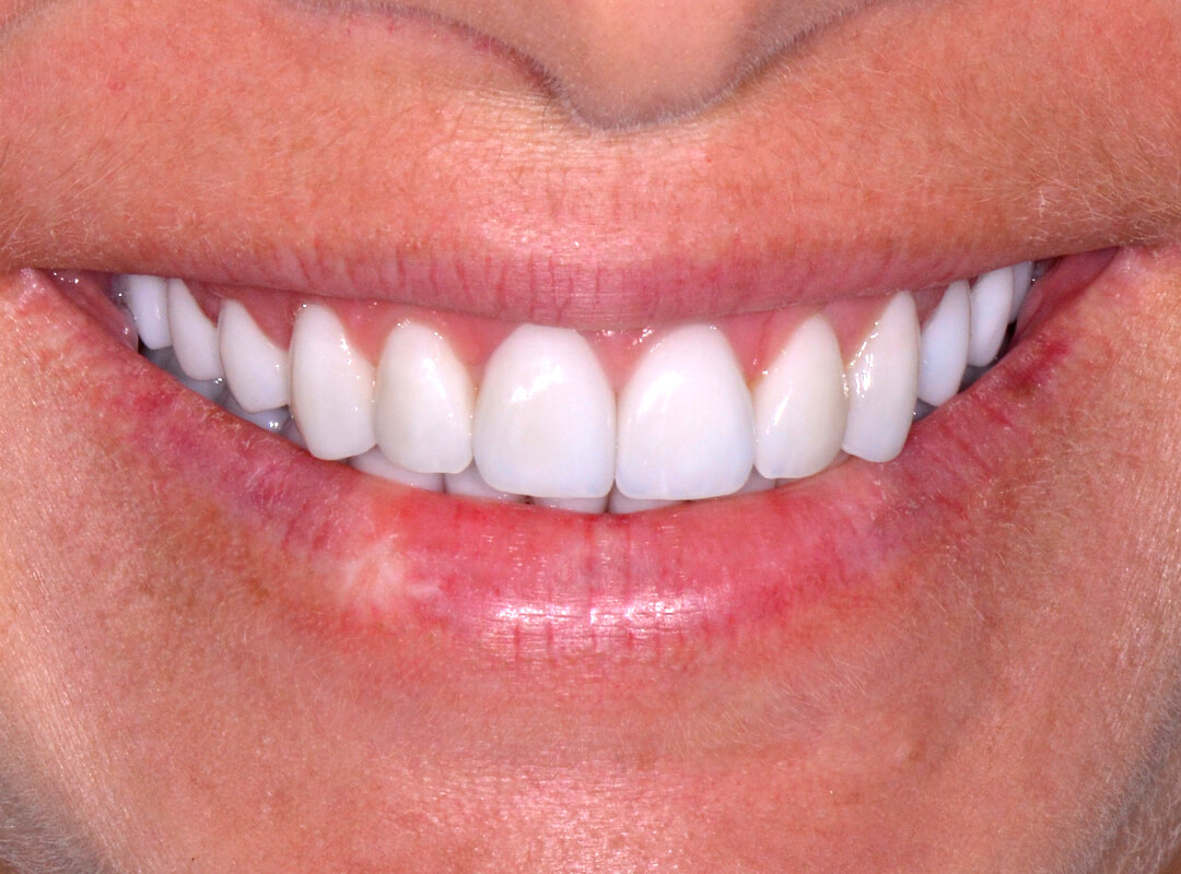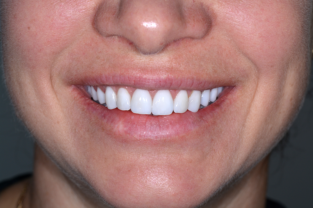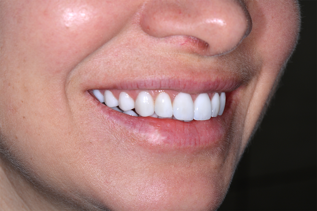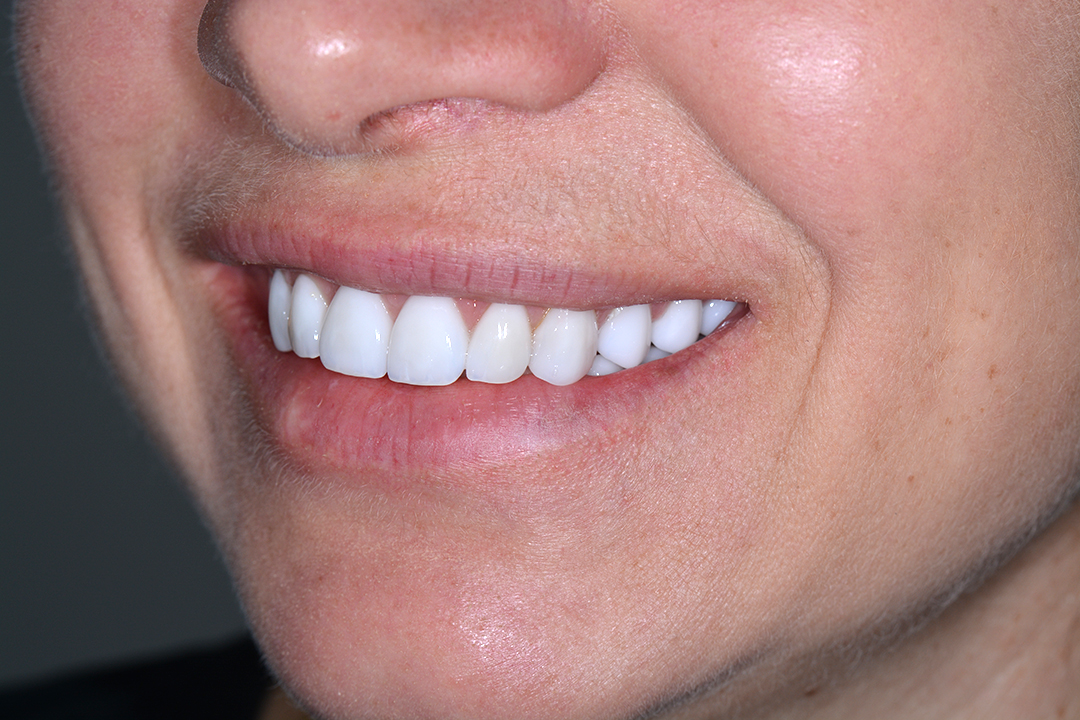 - Затем пациентке сняли временные протезы и прочно закрепили на зубах постоянные виниры и коронки. Хочется напомнить, что E-max – это тот материал, который обладает уникальным свойством: со временем будто врастать в эмаль, становясь с нею единым целым.