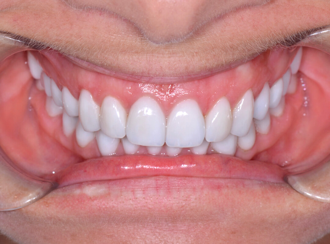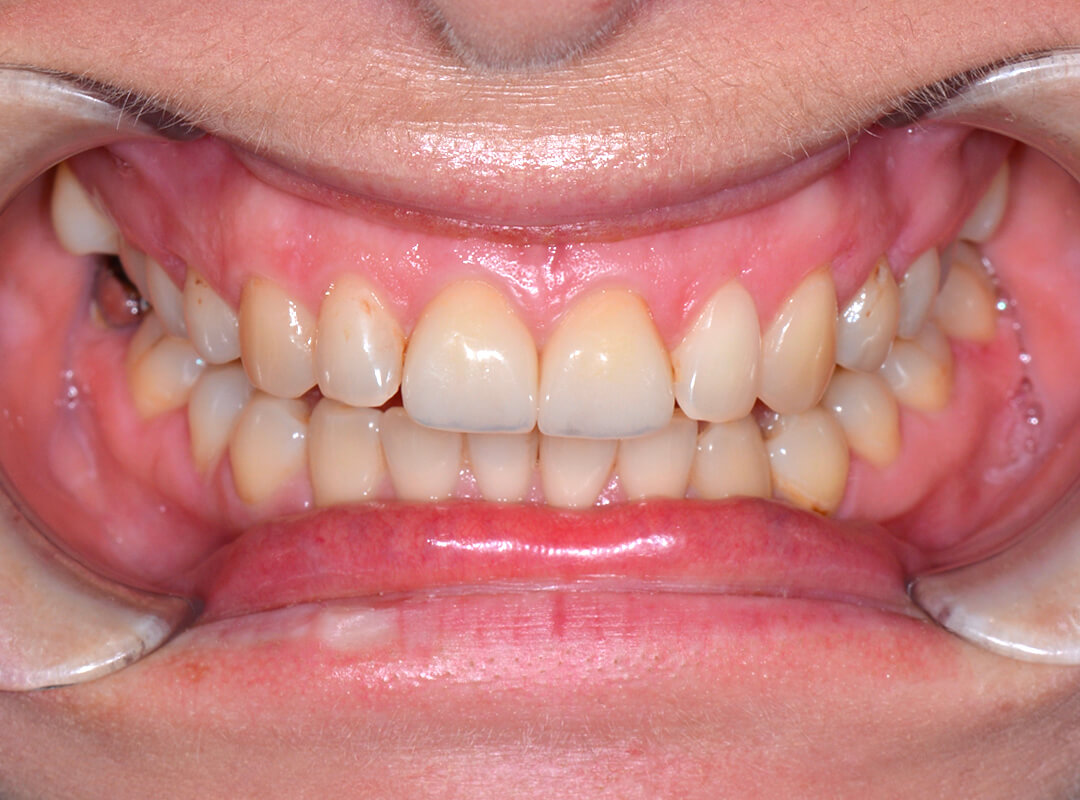 - У пациентки наблюдался глубокий прикус, и поэтому сначала она прошла сплинт-терапию, цель которой была – снизить гипертонус лицевых мышц, восстановить сустав, чтобы привести в норму положение нижней челюсти.